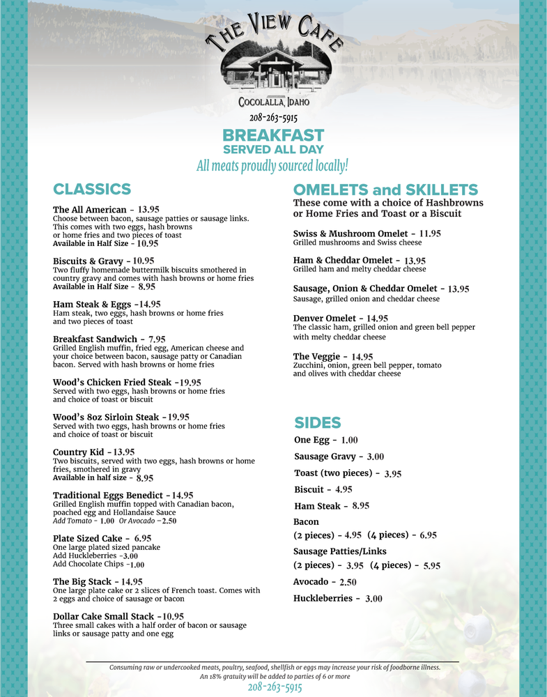 The View Cafe is a charming eatery located in Cocolalla, ID, offering a delightful menu of burgers, breakfast, and brunch items. The cafe provides a range of amenities, including takeout, delivery, waiter service, and free Wi-Fi. Customers rave about the generous portions and friendly service, with dishes like the Cocolalla Popper Burger and the Chicken Fried Steak receiving high praise. The restaurant's clean and modern decor, along with its welcoming atmosphere, create a pleasant dining experience. With a focus on quality ingredients and unique flavor combinations, The View Cafe is a must-visit for those seeking a satisfying meal in a cozy setting.